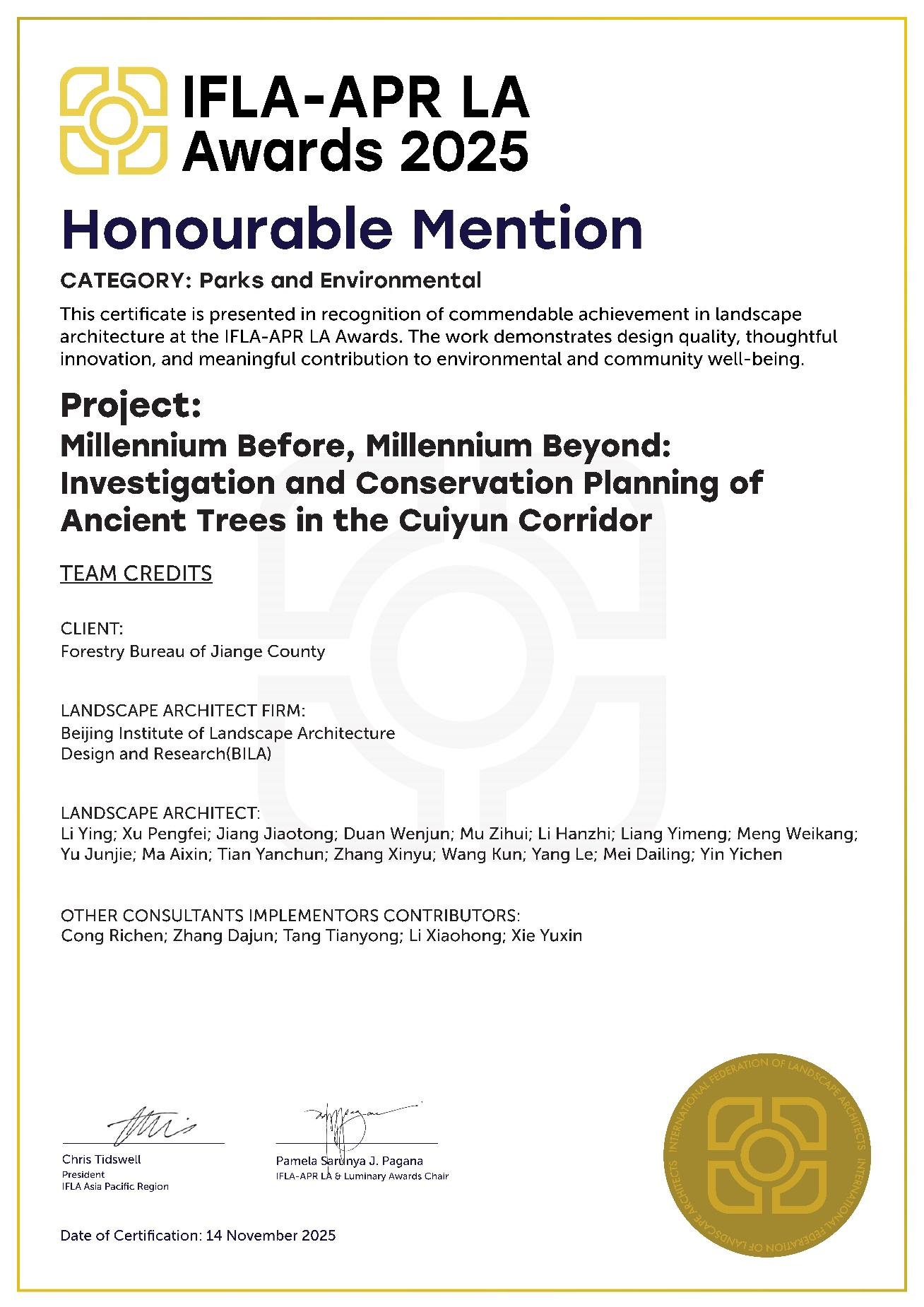 近日,封面新闻记者从四川省林业和草原局获悉,《剑阁县蜀道翠云廊古柏保护规划(2024-2035年)》(以下简称《规划》)获2025年国际风景园林师联合会亚太地区景观设计奖。该奖项被公认为全球景观行业的最高荣誉,代表着景观规划设计领域的国际水准与专业标杆。这也是我国古树名木保护领域首个在全球范围内斩获该奖项的专项规划。